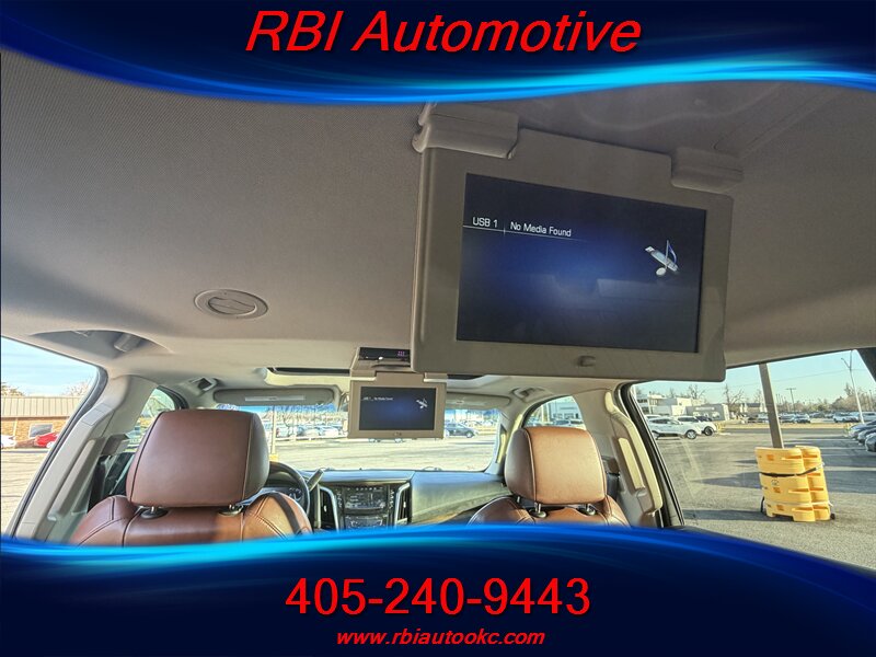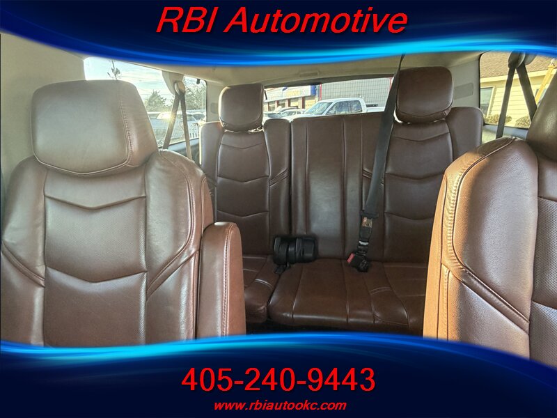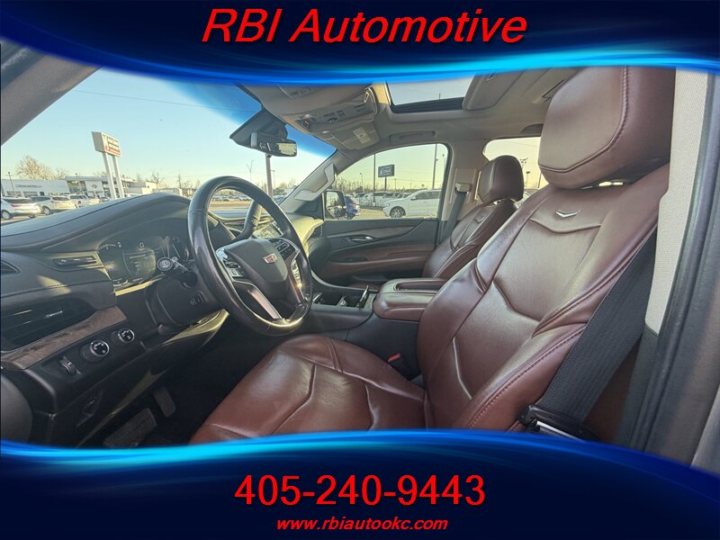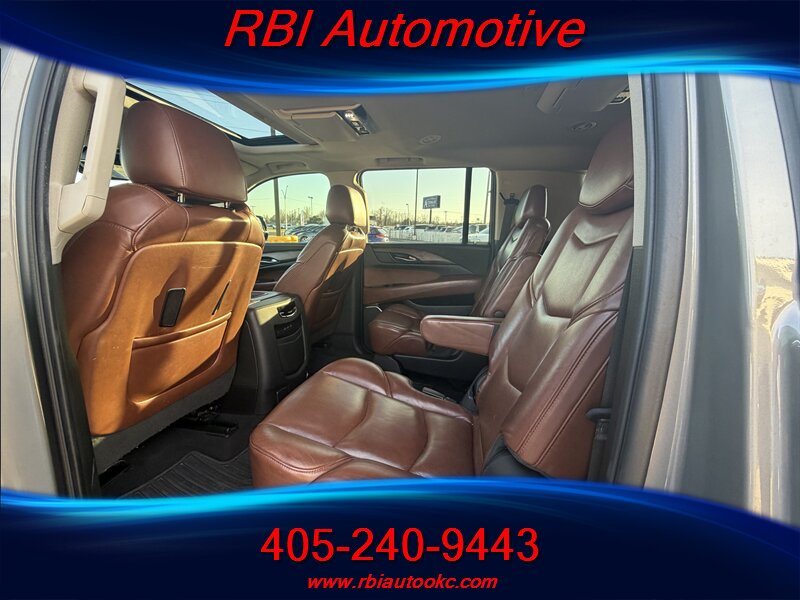 Bright and bold 2019 Cadillac Escalade ESV Premium Luxury finished in Bronze Dune Metallic with a rich Kona Brown interior and Jet Black inserts — powered by the class-leading EcoTec3 6.2L V8 (420 hp, 460 lb-ft) and rated 14 MPG city / 21 MPG highway. Factory-equipped with premium leather seating, heated and ventilated front seats with power adjustments and memory, heated second-row seating, power-folding third row and hands-free power liftgate; tri-zone automatic climate control; Cadillac CUE infotainment with navigation, Apple CarPlay/Android Auto, Bose premium audio, wireless charging and Wi-Fi hotspot; a full complement of driver assists including rearview camera, front/rear parking sensors, blind-spot monitoring, rear cross-traffic alert, lane-keeping and forward-collision alerts, adaptive cruise control, plus stability and traction control. This Escalade is in excellent overall condition and ready to deliver luxury, space, and V8 excitement — a confident, comfortable ride for every journey!